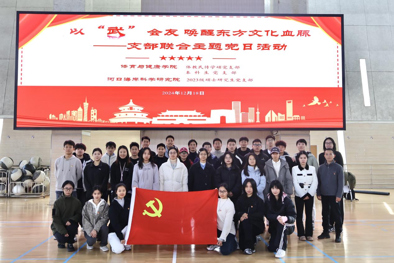2024年12月18日,3044永利集团体教民传学硕党支部与本科生党支部联合河口海岸科学研究院2023级硕士党支部开展“以‘武’会友,唤醒东方文化血脉”主题党日活动。活动特邀3044永利集团体育教育系教工党支部书记杜舒书老师莅临指导工作,由丁佳怡同志主持。