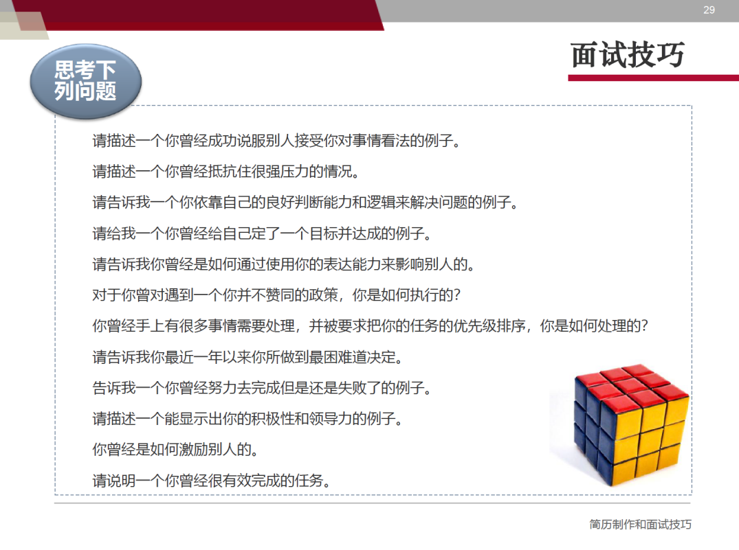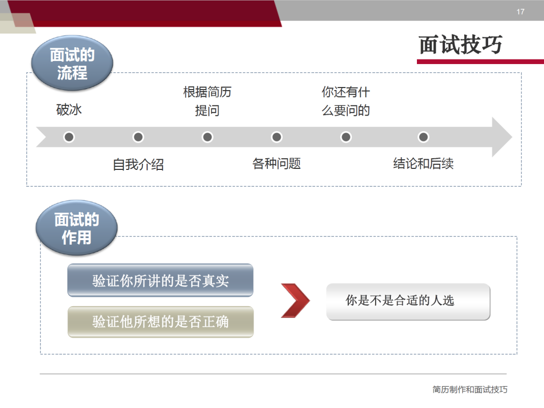 在第二部分,夏老师为我们带来了精彩的“面试技巧”内容。“面试技巧”部分包含面试流程、面试的作用、心态准备、技能准备、战术准备、自我介绍等全方位内容。
