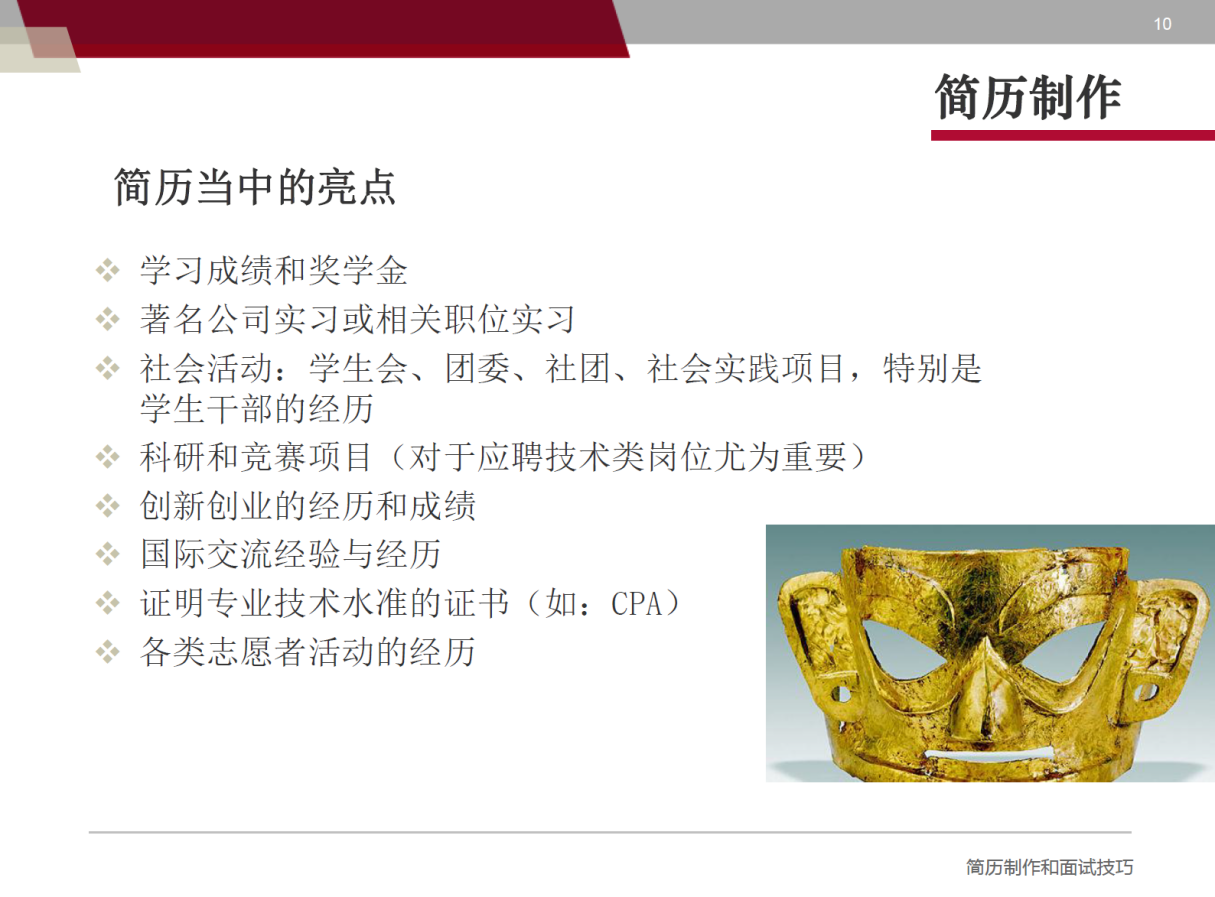 本次讲座分为“简历制作”和“面试技巧”两个部分。首先,夏老师以“什么是简历?”引入该部分内容,夏老师告诉我们,简历要围绕一个求职目标、要把简历看作是一份推销自己的广告和产品说明书,需要陈述有利信息,以争取面试机会。简历应该包含的基本内容有个人资料、求职目标、教育与培训背景、实习和兼职经验、技能特长、奖励与荣誉、兴趣爱好和自我评价一系列内容,同时夏老师就以上每一部分内容都进行了详解,并提示应注意的一些事项。接下来,夏老师为我们讲解简历当中要有的亮点,如学习成绩、奖学金、社会活动、科研竞赛项目、志愿者活动等。以及最后,夏老师就“该怎么准备我的简历”进行了具体细节的阐述。