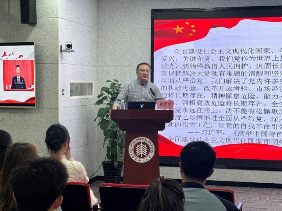 曹景文教授以《自我革命:百年大党的淬炼密码》为主题,从历史纵深维度深挖百年大党的发展史,并结合延安整风运动与新时代反腐败斗争为重要案例,深刻解读了我党坚持刀口向内,遵循党章,剔除自身存在的骄庸散奢懒等不良风气,加强作风建设的良好传统。他强调,坚持自我革命是我党永葆生机活力的根本保证。我们党能长期执政,关键在于我们能得到人民的认可和拥护,在于我们能坚持全心全意为人民服务的根本宗旨。广大入党积极分子要积极上级、自强不息,努力在学习、工作、奉献中实现自己的人生价值。