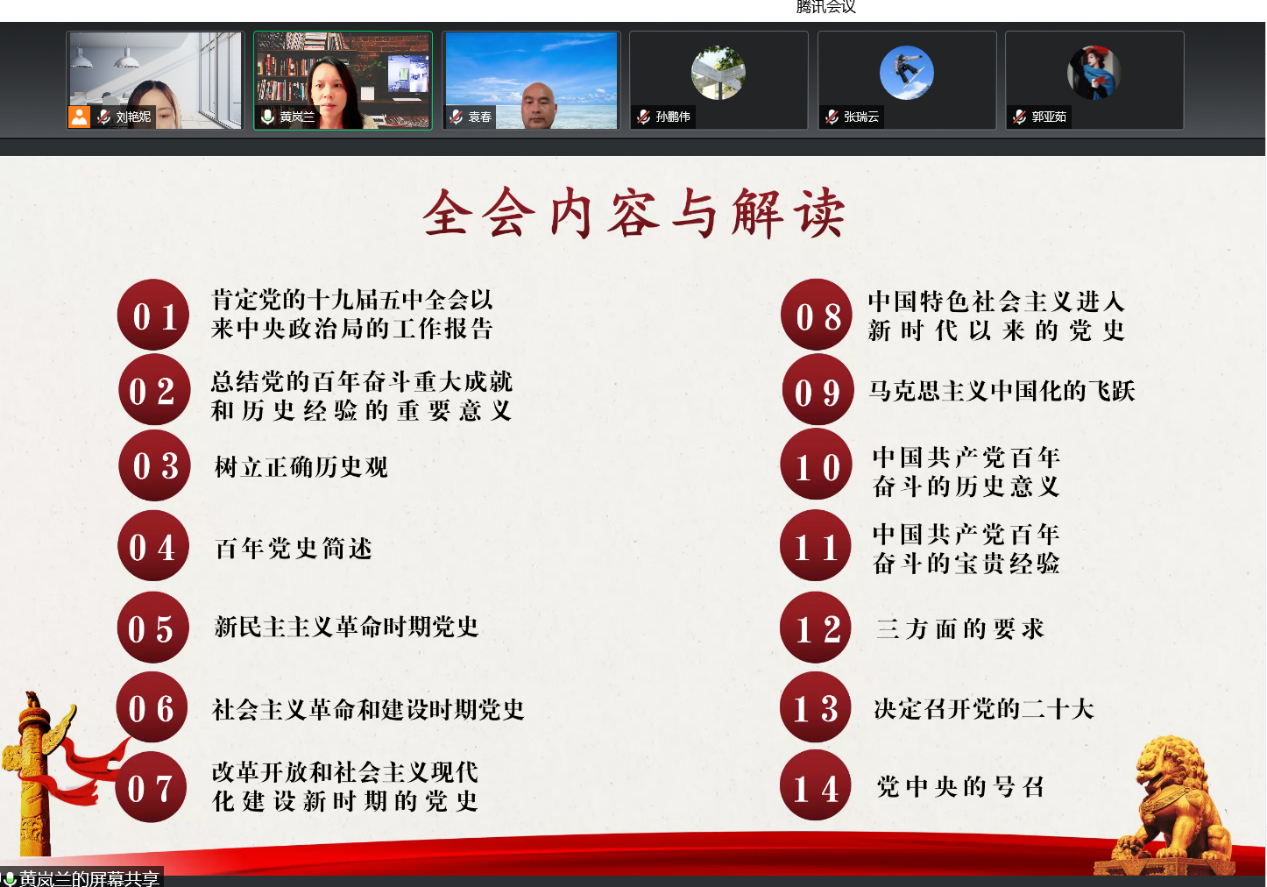 黄岚兰书记首先对十九届六中全会背景与意义进行了概况说明然后,围绕着百年党史简述、马克思主义中国化的飞跃以及党中央的号召等十四个议题,对十九届六中全会的内容和精神进行了全方位的介绍与深刻解读,并对全体党员发出倡议号召大家要全面贯彻习近平新时代中国特色社会主义思想,大力弘扬伟大建党精神,勿忘昨天的苦难辉煌,无愧今天的使命担当,不负明天的伟大梦想,以史为鉴、开创未来,埋头苦干、勇毅前行,立足本岗,建功立业,为实现第二个百年奋斗目标、实现中华民族伟大复兴的中国梦而不懈奋斗。