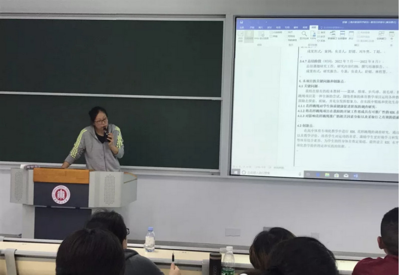 之后,基地学员、来自上海财经大学附属北郊高级中学的舒健老师上台展示了自己的课题申报书,汪晓赞教授针对该申报书从头到尾进行了细致地点评,指出了很多需要改进之处。这些问题基本都是一线体育教师们在撰写申报书过程中遇到的共性问题,这对于基地学员产生了很大的启发。