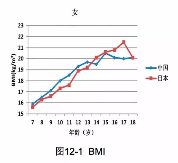 再譬如,7-18岁中日儿童青少年(男)体重统计中,也是除12岁外,中国男生均显著高于日本男生。而中国女生在大部分年龄段显著高于日本女生。