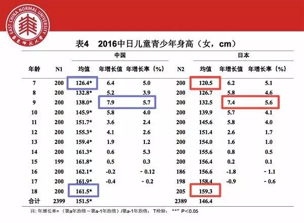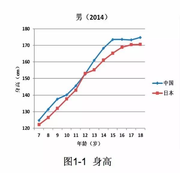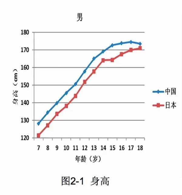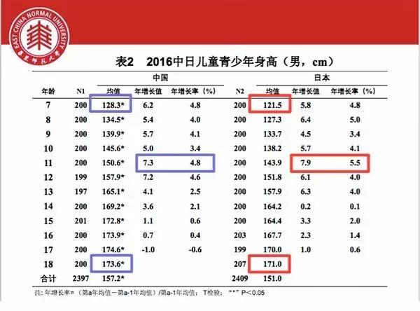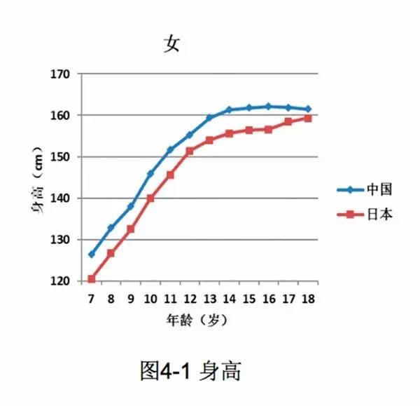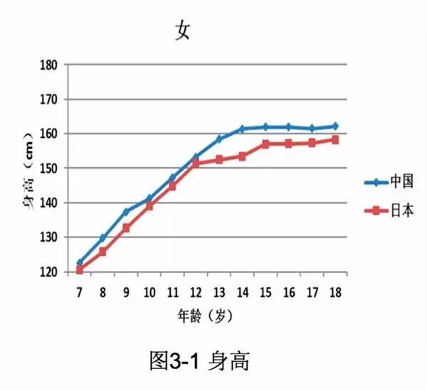 譬如,7-18岁中日儿童青少年(男)身高统计中,除12岁外,中国男生均显著高于日本男生。中国女生各年龄段也均显著高于日本女生。