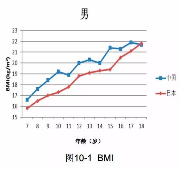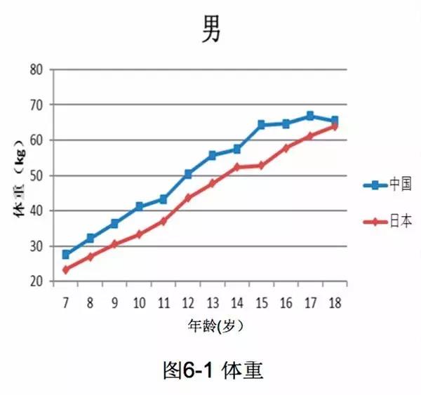 其中,2014年,7-18岁中国男生平均体重48.7kg,高于日本男生的44kg,而在2016年,7-18岁中国男生平均体重50.4kg,高于日本男生的44.3kg。