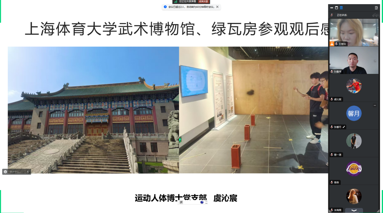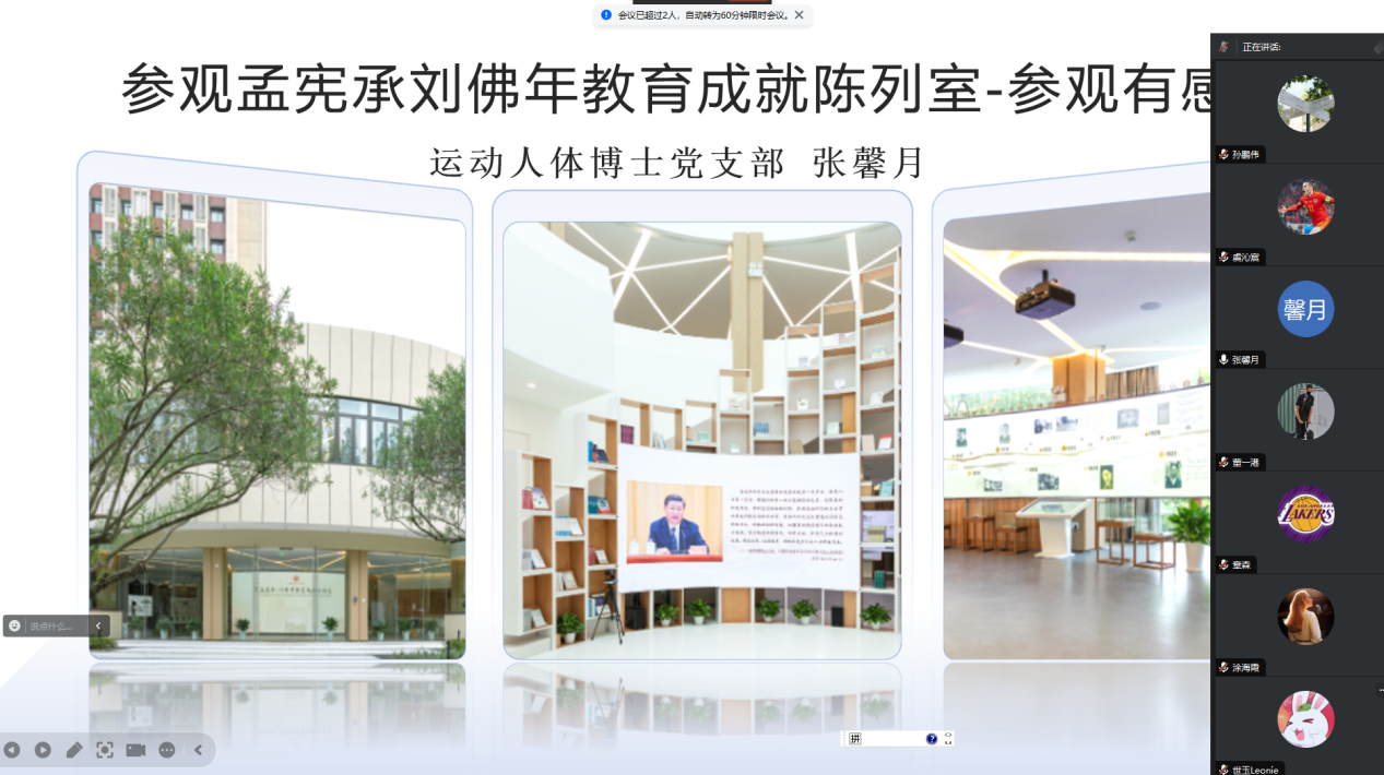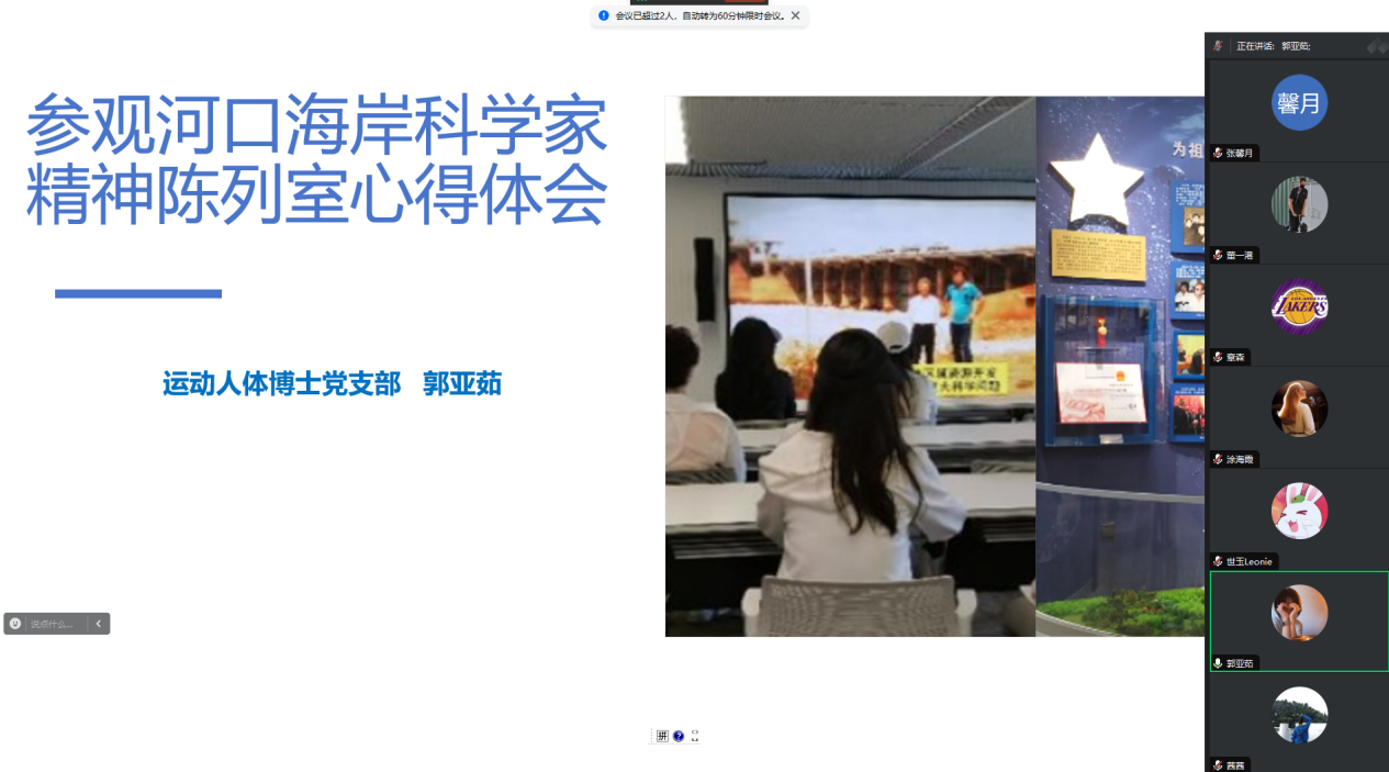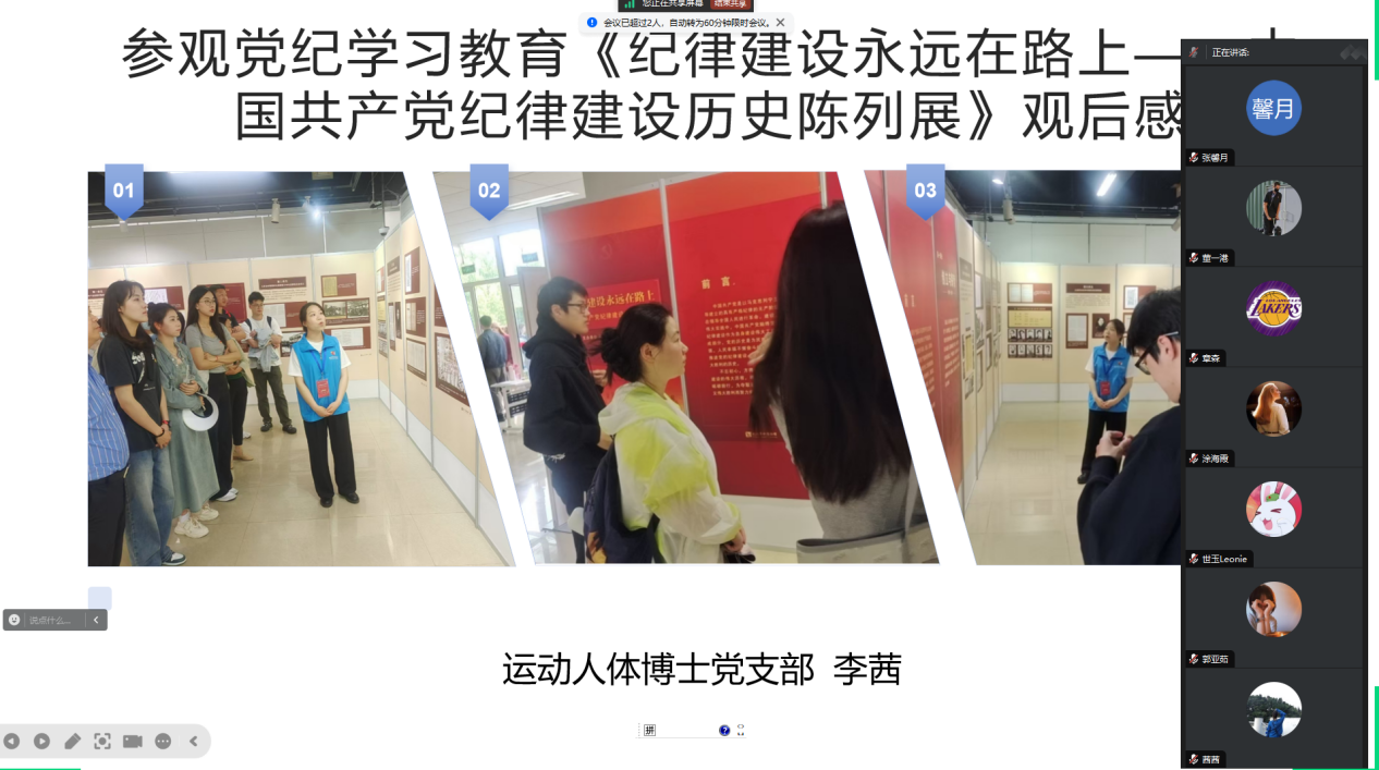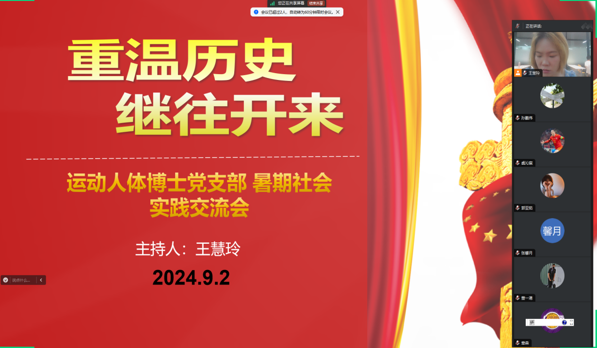 为积极响应教育部有关于深化高校员工暑期社会实践的相关要求与公司党委组织部指导意见,全面落实公司制定的《3044永利集团师生党员基本培训实践教学工作方案》,进一步了解党的艰辛历程、光荣传统、宝贵经验和伟大成就,继承弘扬伟大建党精神,运动人体博士党支部于2024年9月2日以“重温历史,继往开来”为主题召开线上暑期社会实践交流会,支部党员对个人或小组的暑期实践经历进行总结并作交流分享,支部全体成员参加,会议由王慧玲同志主持。
