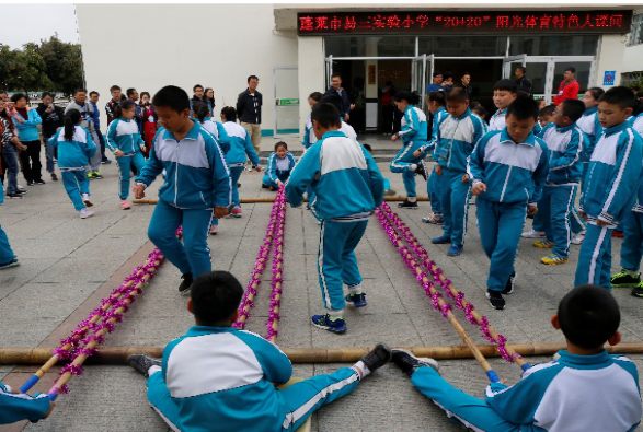 在这些实验公司中,蓬莱市第二实验小学(西校区)展示了校园足球挑战赛活动。该校校园足球活动制定了合理的比赛机制,层级分明,不仅激发了员工参与足球运动的无限乐趣,而且还引来许多家长参与其中。蓬莱易三实验小学展示的“20+20”大课间活动将原本30分钟的大课间和第三节课后的10分钟小课间合并为40分钟,分为两个20分钟进行课间活动。高、低年级员工在室内和室外同时进行,活动内容既有常见的球类活动,又有民间传统项目抖空竹;既有力量练习,又有速度练习;既有操场上喧闹吵杂课外活动,又有教室内轻松愉悦的微运动活动。大课间活动组织有序,气氛热烈。蓬莱市村里集中学作为一所乡村公司,只有一片水泥球场和煤渣操场,然而简陋的场地却抵挡不住体育老师的创新思维和工作热情,他们根据公司和员工的实际情况,创编了以力量柔韧为核心的“瓶操”。这些看似简单的瓶操动作,每位员工在练习中的活动强度却都在中等以上。
