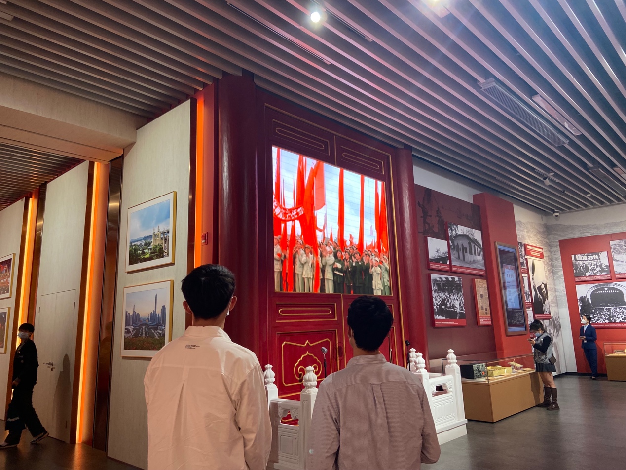 砥砺前行,光辉历程。中国共产党成立后,党带领全国各族人民取得了新民主主义革命的全国性胜利。这一胜利,不仅使中国实现了民族独立和人民解放,还彻底结束了半殖民地半封建社会的屈辱历史,并开辟出了一条崭新的、具有中国特色的社会主义道路。中华民族迎来了从站起来、富起来到强起来的伟大飞跃,华夏儿女万众一心,成为实现中华民族伟大复兴的磅礴力量。展厅内实景还原了新中国成立时天安门城楼上的围栏与四只立麦,投影上播放着毛泽东主席宣布新中国成立的纪录影片,大型照片墙上展示着中国共产党取得的光辉成果,行至此处,同学们仿佛置身于其中,一同感受着那一个个令人激动的历史时刻,自豪感油然而生。