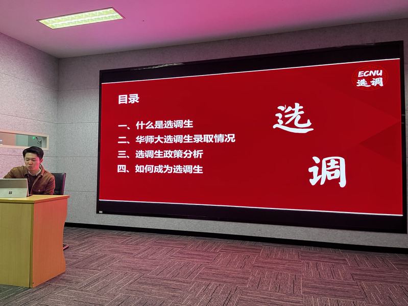 山海奔赴,共筑强国。在对党章新内容的学习结束后,选调生宣讲团的张啸男同学为大家展开了关于“选调生的战略意义和政策设计”的讲座,从“什么是选调生”、“华师大选调生录取情况”、“选调生政策分析”、“如何成为选调生”四个方面对选调生工作进行了详细介绍。张啸男同学提到:“选调生是奉献的而非功利的、挑战的而非稳定的、卓越的而非平庸的”。同时,此次宣讲还对选调生选拔的基本要求进行了阐述,在对基本情况介绍完毕后,张啸男学长还向同学们介绍了上海、浙江、四川、陕西等省市选调生的岗位以及招录要求。近年来,参与选调生的考核与选拔的人数越来越多,竞争压力越来越大,张啸男学长鼓励同学们努力奋斗,只要有一颗坚定以及乐于奉献的心,就一定会在岗位上发光发热。