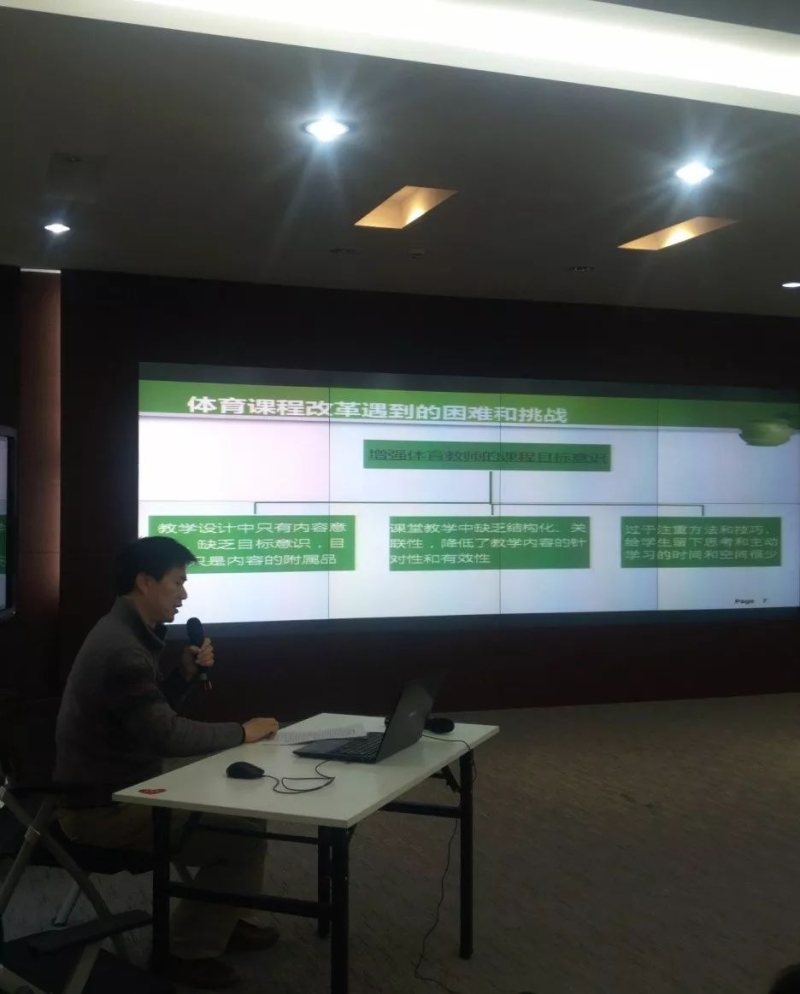 首先,来自普陀区晋元高级中学的梁胜老师代表第1小组做了《公司体育将迎来新发展时代》和《体育与健康课程还须深化改革》的交流。他就《关于强化公司体育促进员工身心健康全面发展的意见》与学员进行了探讨。从体育课程改革中《体育与健康课程标准》的再学习、再认识,增强体育教师的课程目标意识,大学与中小学应紧密合作三方面遇到的困难和挑战进行了交流。