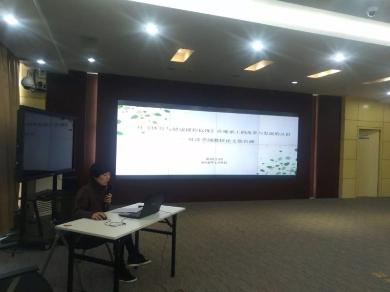 第三,来自上海财经大学附属北郊高级中学的舒键老师代表第3小组做了交流。她首先带领学员对《体育之研究》进行再学习交流,然后就体育与健康课程标准下的新思想、新理念、教学中理论与实践的转换进行了交流。