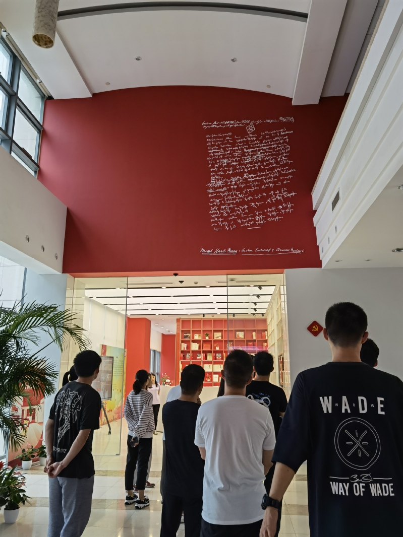 中心外墙上熠熠生辉的一段文字吸引了大家的注意力,原来这是现存于世的唯一一页马克思《共产党宣言》的手稿拓印,寓意着“信仰之光照亮共产党人的奋斗之路”。