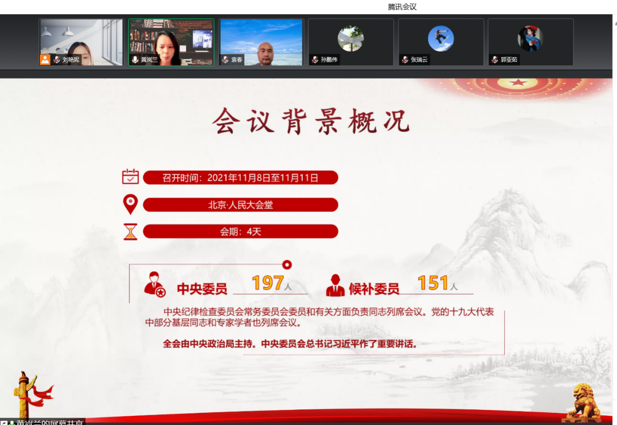 黄岚兰书记首先对十九届六中全会的背景与意义进行了概况说明,然后,围绕着百年党史简述、马克思主义中国化的飞跃以及党中央的号召等十四个议题,对十九届六中全会的内容和精神进行了全方位的介绍与深刻解读,并对全体党员发出倡议,号召大家要全面贯彻习近平新时代中国特色社会主义思想,大力弘扬伟大建党精神,勿忘昨天的苦难辉煌,无愧今天的使命担当,不负明天的伟大梦想,以史为鉴、开创未来,埋头苦干、勇毅前行,立足本岗,建功立业,为实现第二个百年奋斗目标、实现中华民族伟大复兴的中国梦而不懈奋斗。