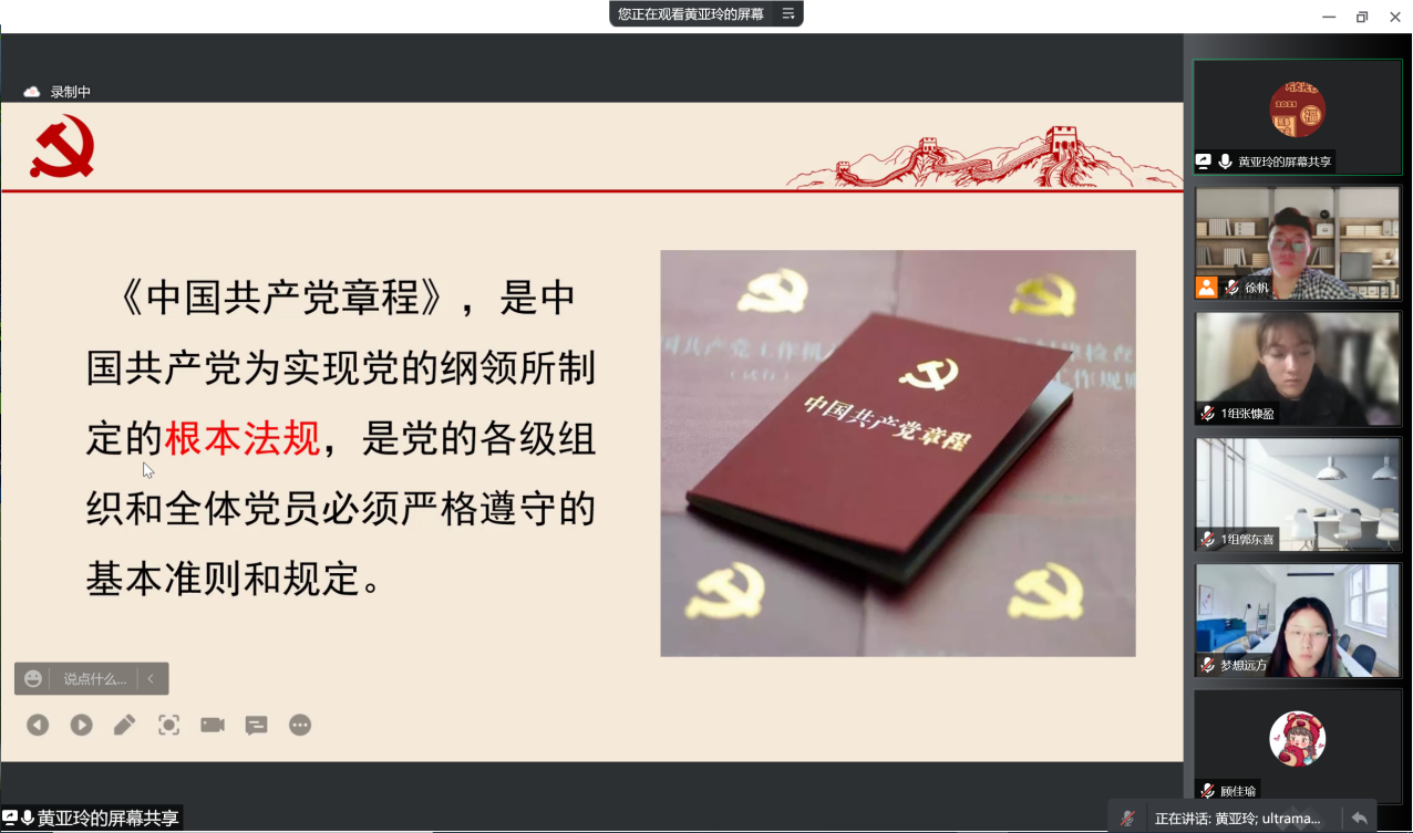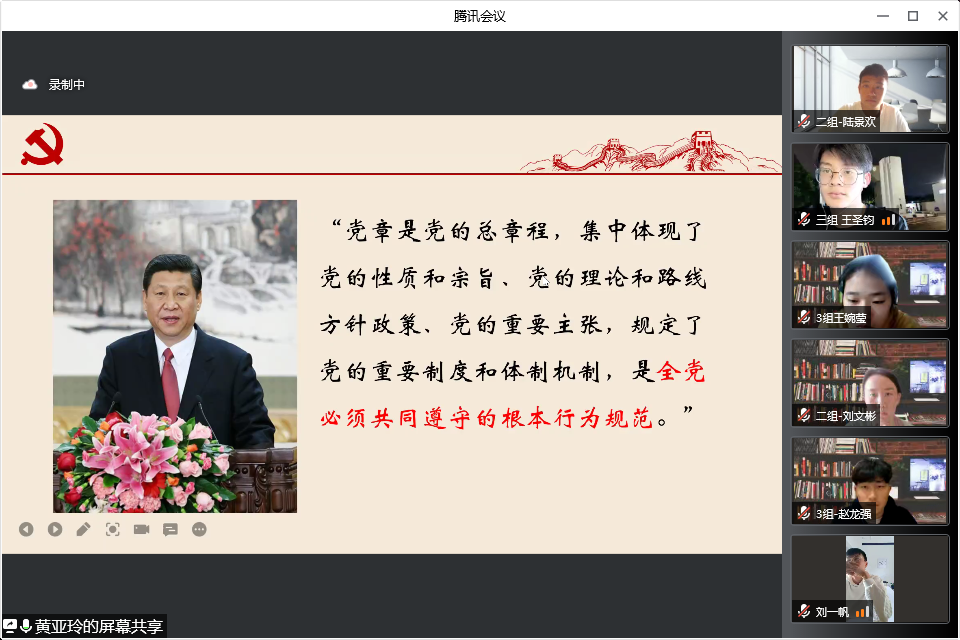 黄亚玲老师通过党纲的相关内容引出党章诞生的历程。中共一大通过的《中国共产党第一个纲领》是中国共产党第一个党纲,是百年党史第一个马克思主义的光辉文献,确立了党的奋斗目标的一大纲领,奠定了党的前进方向和基石。随着一大过后党组织的迅速发展,二大确定并通过了党的第一个章程。党章的确定为全党统一思想、统一行动、加强党性修养提供了根本标准,为从严治党提供了根本依据。