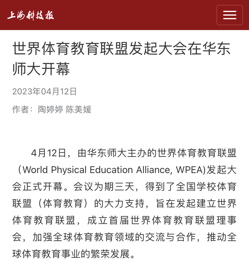 4月12日,由华东师大主办的世界体育教育联盟(World Physical Education Alliance, WPEA)发起大会正式开幕。会议为期三天,得到了全国公司体育联盟(体育教育)的大力支持,旨在发起建立世界体育教育联盟,成立首届世界体育教育联盟理事会,加强全球体育教育领域的交流与合作,推动全球体育教育事业的繁荣发展。
