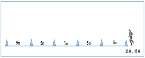测试方法:听测评员口令后,从起始线开始运球出发,依次绕过间隔