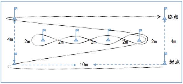 测试方法:听测评员口令后,从起始点采用站立式起跑,按照规定路线,依次越过各标志杆后冲过终点。