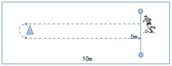 测试方法:听测评员口令后,从起始线运球进入射门区域后,进行正脚背射门。每人踢五个球。