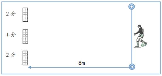 测试方法:听测评员口令后,将摆在罚球区线上的足球踢向球门,每人踢五个球。