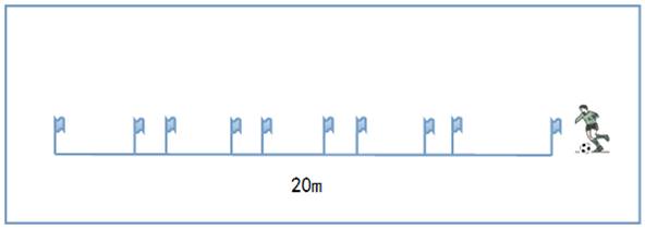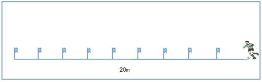 测试方法:听测评员口令后,从起始线开始运球出发,依次绕过间隔不等的8个标志杆,以球踩终点线为结束。