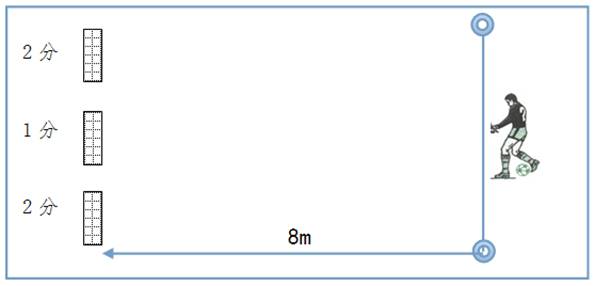 评分方法: 测评员计分,踢进中间球门得1分,踢进两侧球门得2分,按照每个球踢进球门的分数累计相加得出最后分数。测试两次,记录其最佳成绩。