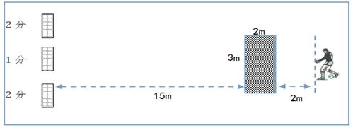 评分方法: 测评员计时,对照评分标准给予相应成绩,测试两次,记录最佳成绩,碰倒杆或漏杆则成绩无效。